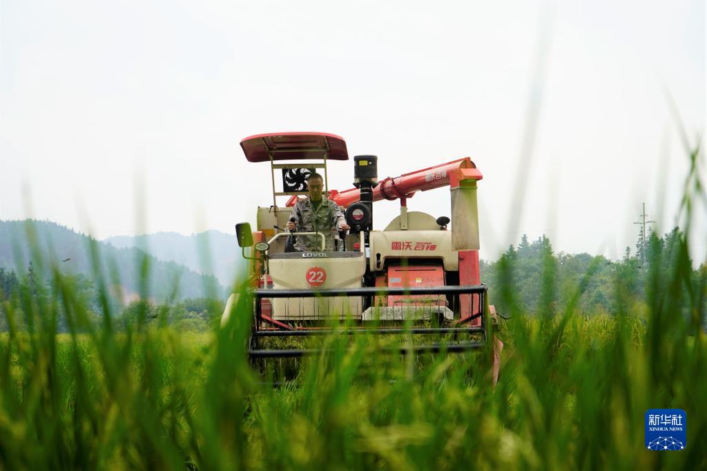 10月10日,農機手駕駛收割機在湖南省靖州苗族侗族自治縣甘棠鎮溪口村收割制種水稻。