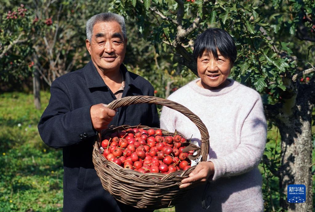10月10日,在北京市平谷區熊兒寨鄉魏家灣村的一處紅果種植園,村民展示采摘的紅果。