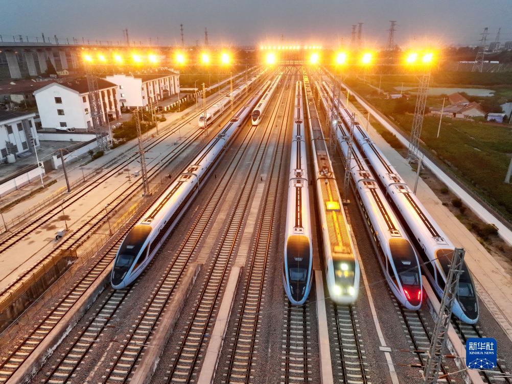 10月10日,動(dòng)車(chē)組列車(chē)停在江蘇省連云港市境內存車(chē)場(chǎng)等待發(fā)車(chē)(無(wú)人機照片)。