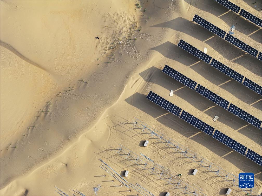 這是10月10日拍攝的建設中的庫布其沙漠鄂爾多斯中北部新能源基地(無(wú)人機照片)。