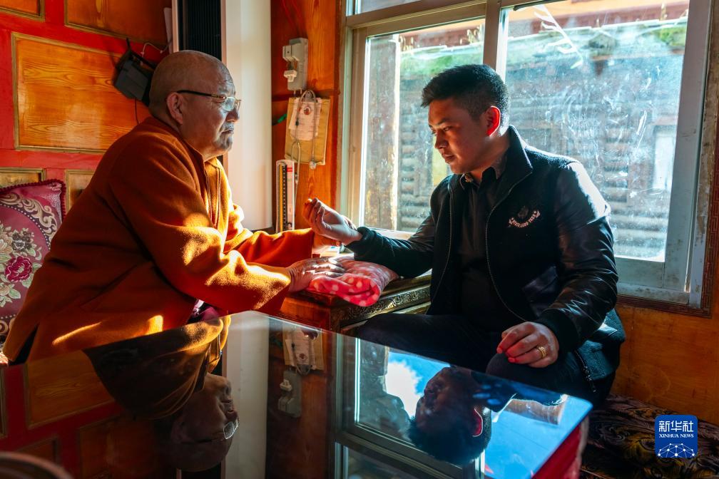 10月10日,在四川甘孜藏族自治州理塘縣,囊索·嘉培藏醫世家第八代傳承人尖安益西(左)為當地群眾診療。