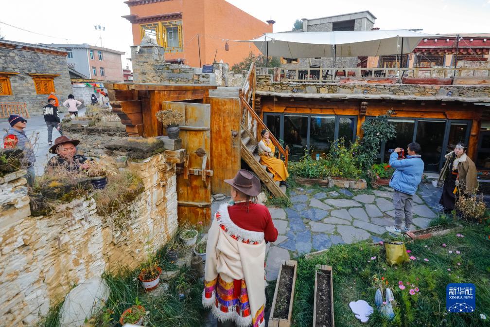 10月10日,在四川甘孜藏族自治州理塘縣,游客在一家由藏族傳統建筑改造而成的藏餐館內拍攝。