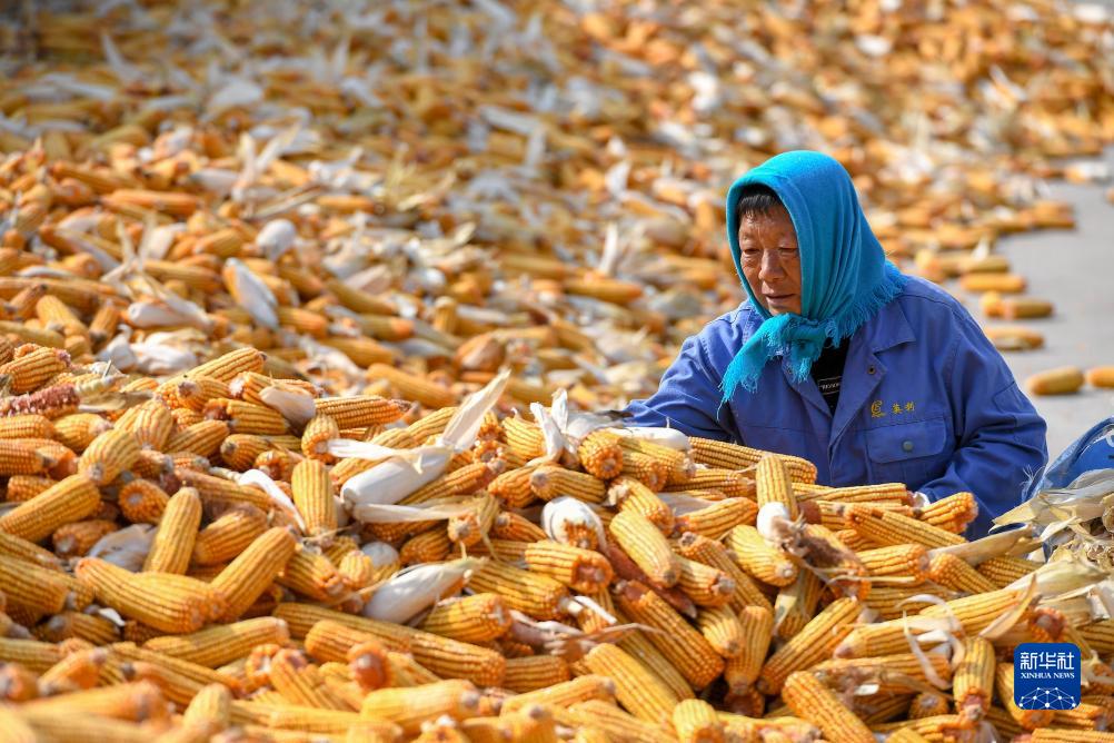 10月11日,在吉林省公主嶺市范家屯鎮乾程農民專(zhuān)業(yè)合作社,農民整理收獲的玉米。