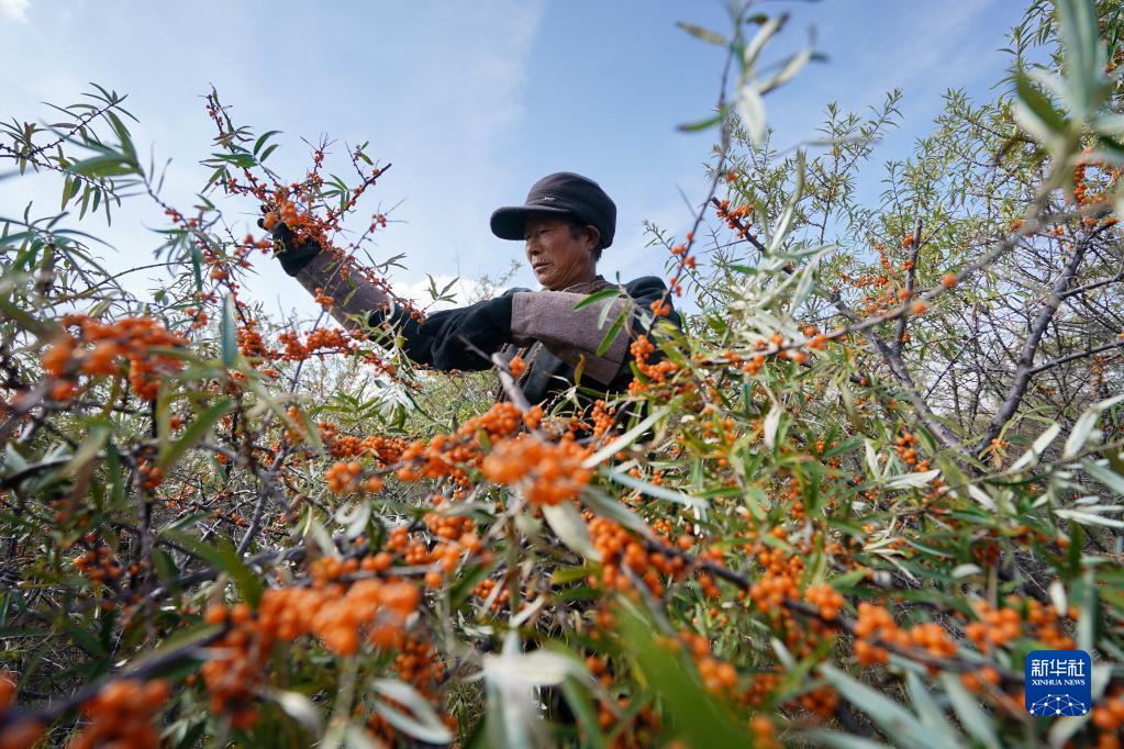 10月11日,沽源縣小廠(chǎng)鎮農民在采摘沙棘果。