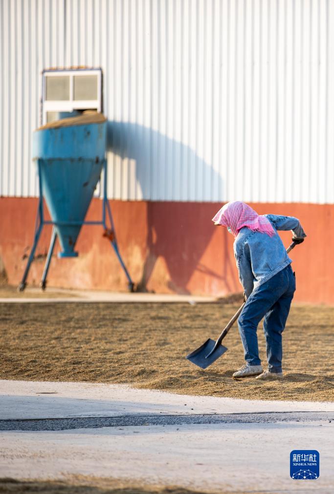 在寧夏銀川市賀蘭縣立崗鎮通義村,農民在曬場(chǎng)勞作(10月10日攝)。