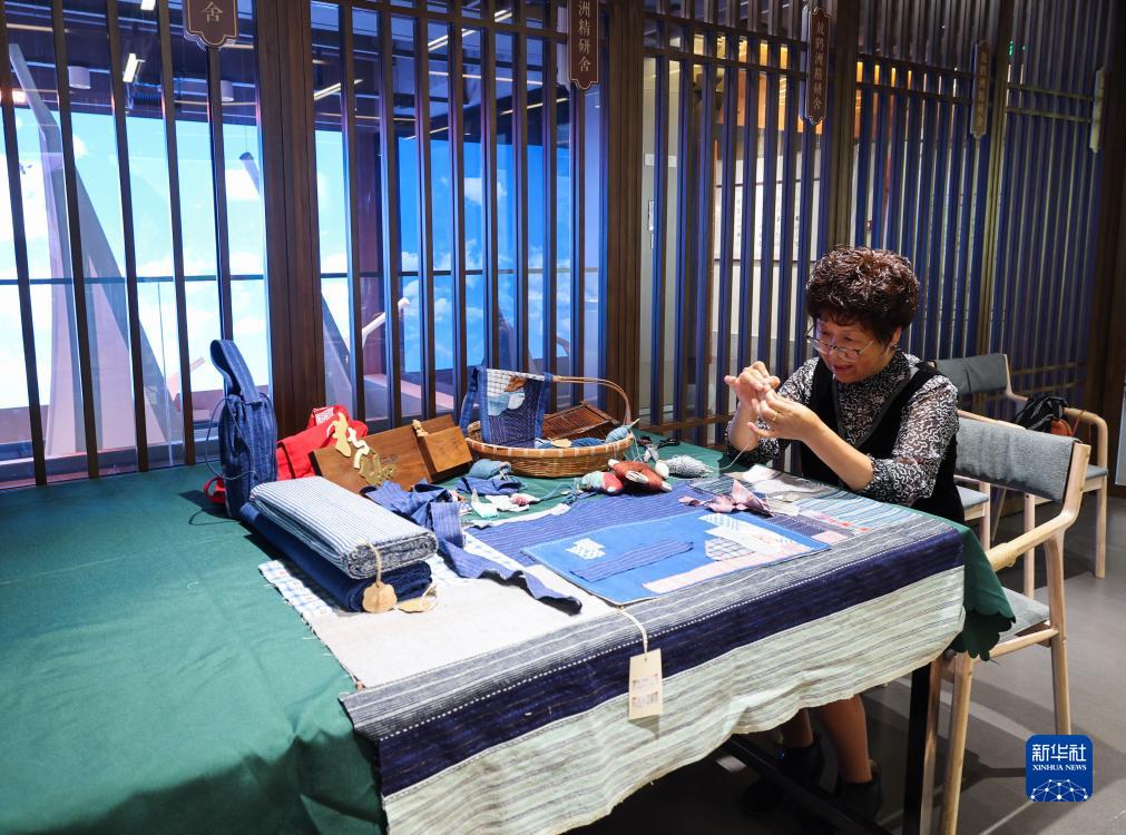 10月11日,游客在大運河數字詩(shī)路e站的互動(dòng)功能區內體驗傳統針線(xiàn)縫制。