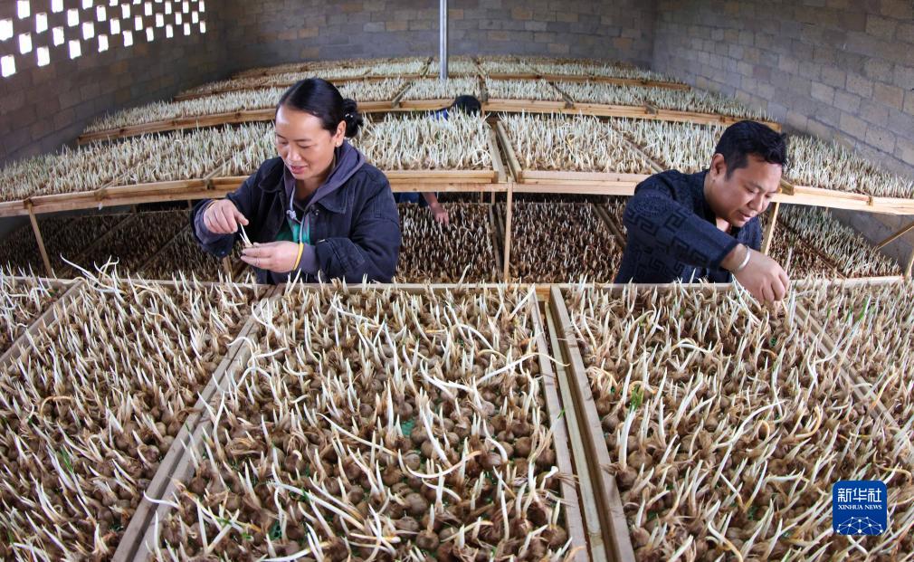 10月11日,在貴州省銅仁市玉屏侗族自治縣朱家場(chǎng)鎮混寨村西紅花種植基地,村民在給西紅花苗抹芽。