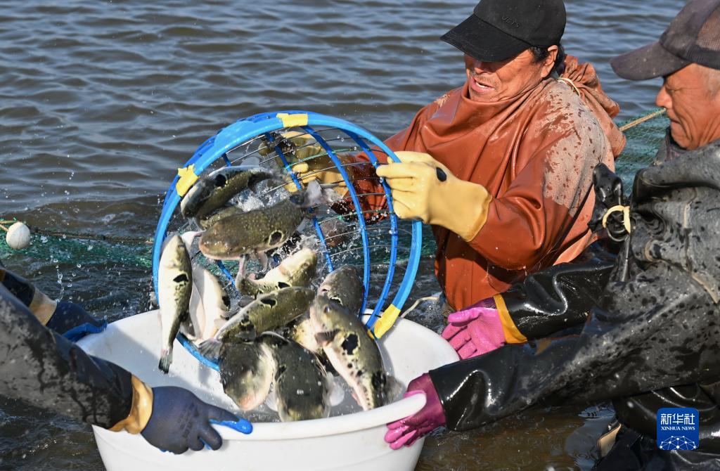 10月11日,唐山市曹妃甸區柳贊鎮一家河豚魚(yú)養殖合作社的社員在池塘捕撈河豚魚(yú)。