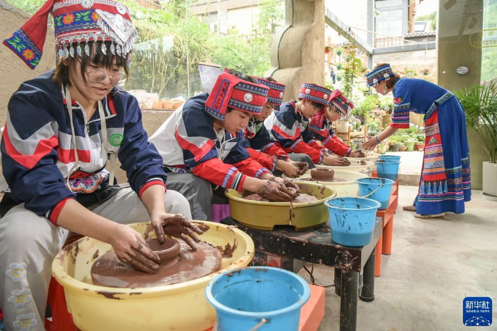 10月10日,來(lái)自重慶梁平職教中心的學(xué)生們在橋頭鎮的陶然居瓦屋小寨陶藝手工坊內體驗陶藝制作。