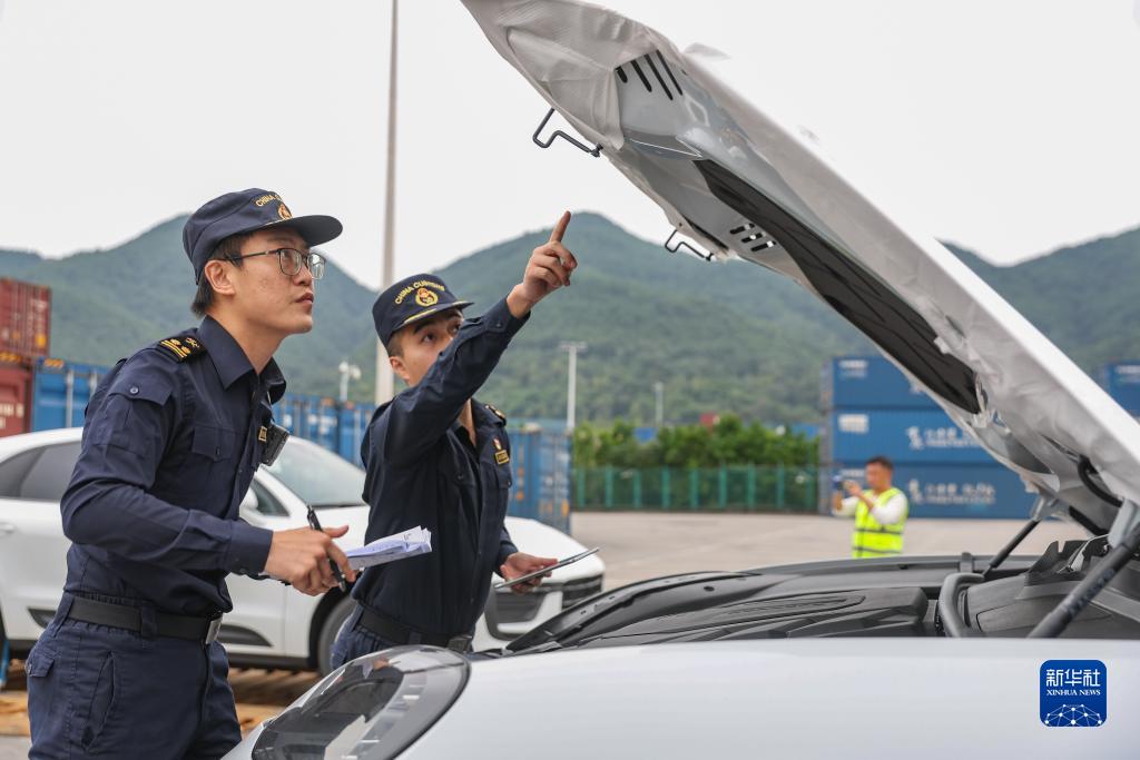 10月11日,在位于重慶國際物流樞紐園區的重慶汽車(chē)整車(chē)進(jìn)口口岸,重慶海關(guān)所屬渝州海關(guān)關(guān)員對進(jìn)口整車(chē)進(jìn)行查驗。