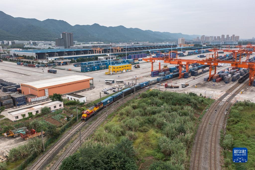 10月11日,一列滿(mǎn)載重質(zhì)純堿、汽油機等貨物的西部陸海新通道班列,從位于重慶國際物流樞紐園區的重慶團結村中心站駛出(無(wú)人機照片)。