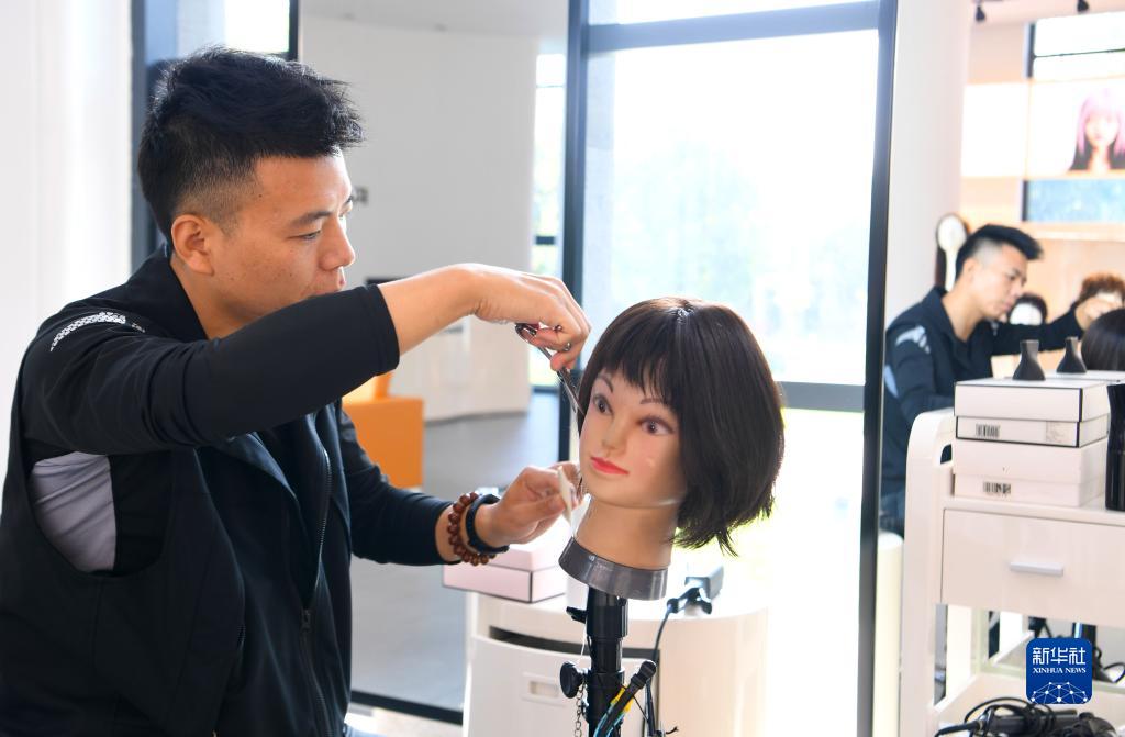 10月11日,工作人員在河南瑞貝卡發(fā)制品股份有限公司的展廳內修剪假發(fā)。