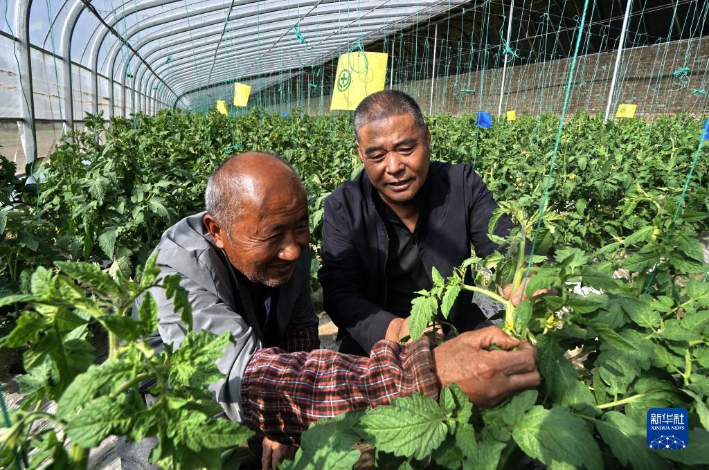 10月10日,大興區長(cháng)子營(yíng)鎮潞城營(yíng)一村黨支部書(shū)記連書(shū)山(右)和管護大棚的農民在觀(guān)察大棚蔬菜長(cháng)勢。