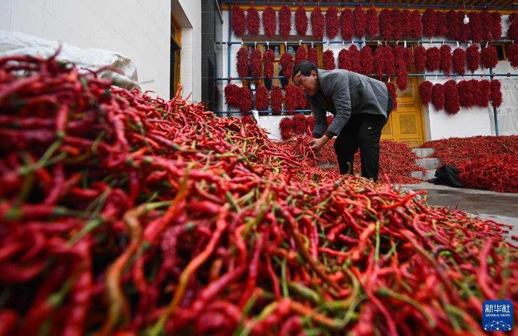 10月12日,在青海省海東市循化撒拉族自治縣清水鄉田蓋村,種植戶(hù)在晾曬線(xiàn)椒。