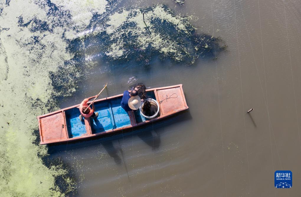 10月12日,蟹臨門(mén)太湖蟹共富養殖基地的蟹農在養殖基地內捕撈太湖蟹,水面上漂浮的是用于生態(tài)養殖的浮萍和水草(無(wú)人機照片)。