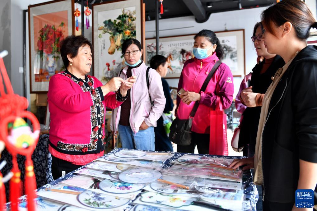 10月12日,在石家莊市鹿泉區土門(mén)關(guān)驛道小鎮,河北省級非遺傳承人邢蘭芳(左一)向游客介紹邢氏刺繡工藝。