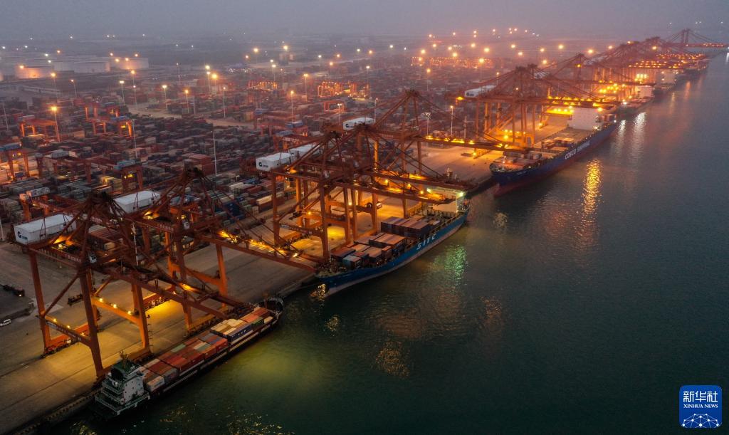 夜幕下,海輪在欽州港碼頭裝卸貨物(2021年3月24日攝,無(wú)人機照片)。