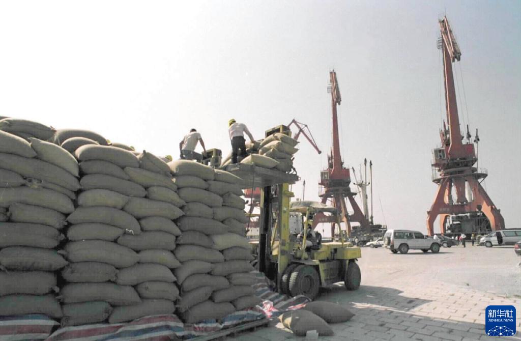 這是2004年4月9日在欽州港碼頭拍攝的出口物資裝運場(chǎng)景。