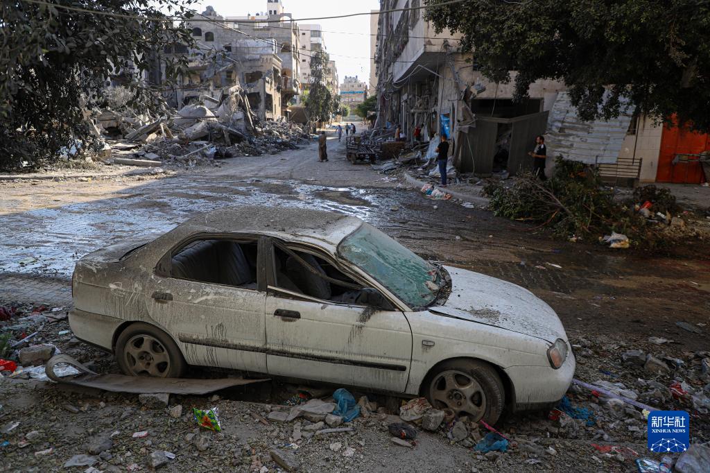 這是10月12日在加沙城拍攝的一輛被以色列軍隊空襲炸毀的汽車(chē)。