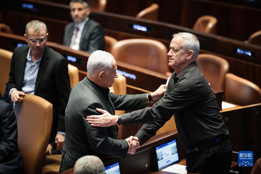 10月12日,在耶路撒冷,以色列總理內塔尼亞胡(左)與前國防部長(cháng)甘茨出席特別會(huì )議時(shí)握手。