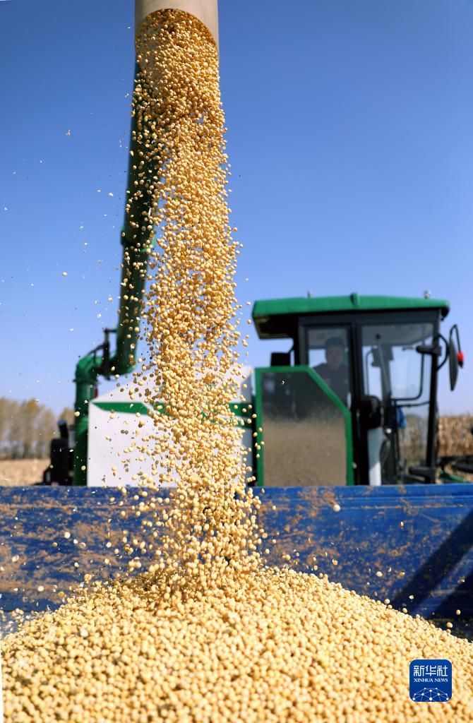 10月12日,農機在昌圖縣亮中橋鎮亮中村的大豆田里裝運剛剛收獲的大豆。