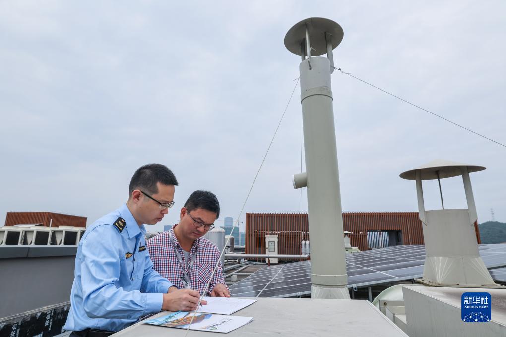 10月13日,杭州市生態(tài)環(huán)境局臨安分局的工作人員在企業(yè)樓頂根據排放情況對照填寫(xiě)環(huán)保體檢單。
