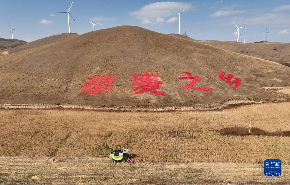 收割機在河北省沽源縣白土窯鄉陳家營(yíng)村田地里收割藜麥(10月12日攝,無(wú)人機照片)。