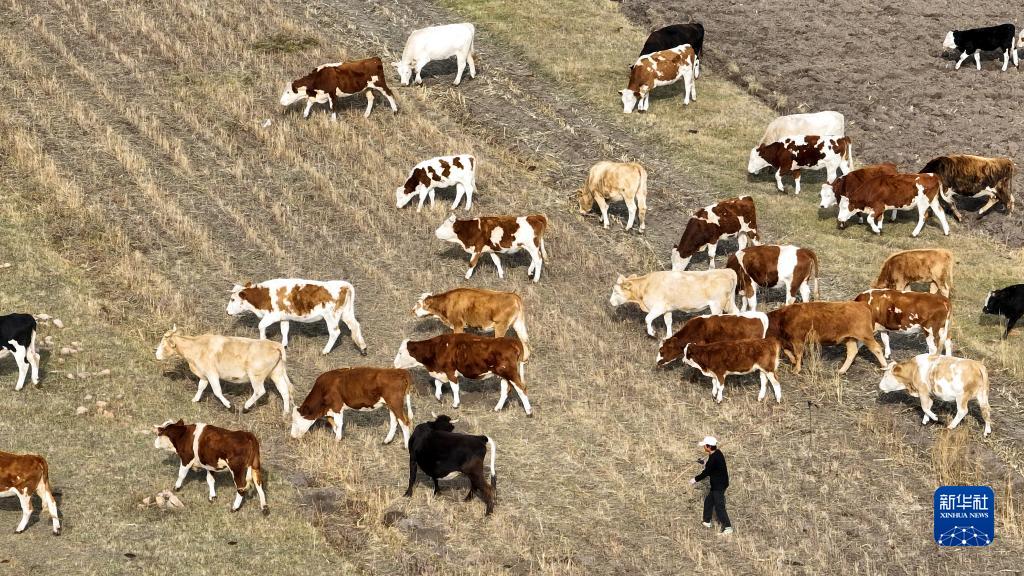 10月13日,牧民在內蒙古自治區赤峰市克什克騰旗放牛(無(wú)人機照片)。