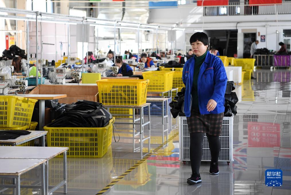 10月11日,河北省康??h康保鎮一家箱包生產(chǎn)企業(yè)的工人在運輸箱包半成品。