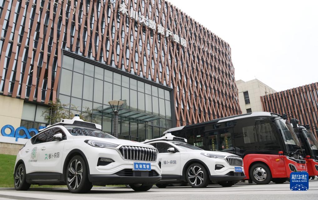 10月11日在重慶永川大數據產(chǎn)業(yè)園拍攝的對外展示的無(wú)人駕駛商業(yè)運營(yíng)車(chē)等智能車(chē)輛。