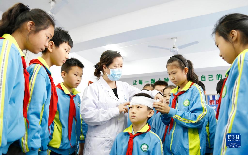 10月13日,在河北省邢臺市家樂(lè )園小學(xué),學(xué)生在醫護人員指導下學(xué)習緊急救護知識。