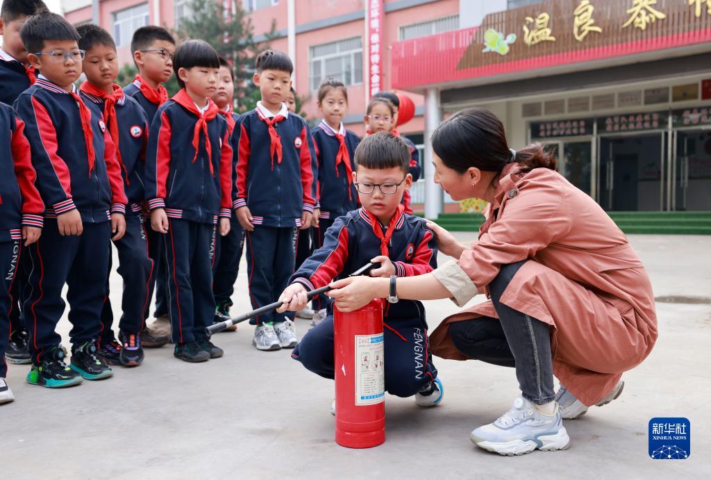 10月13日,河北省唐山市豐南區岔河小學(xué)的教師為學(xué)生講解滅火器的使用方法。