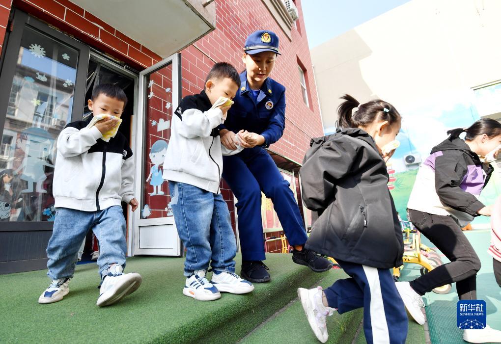 10月13日,河北省石家莊市井陘縣第一幼兒園的小朋友進(jìn)行火災逃生演練。