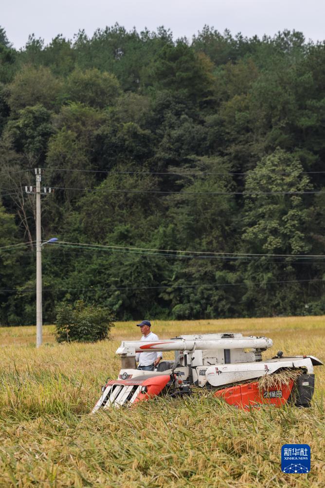 10月13日,在杭州臨安太陽(yáng)鎮的杭州臨安元生糧油專(zhuān)業(yè)合作社生態(tài)稻田內,種植戶(hù)用收割機收割生態(tài)水稻。