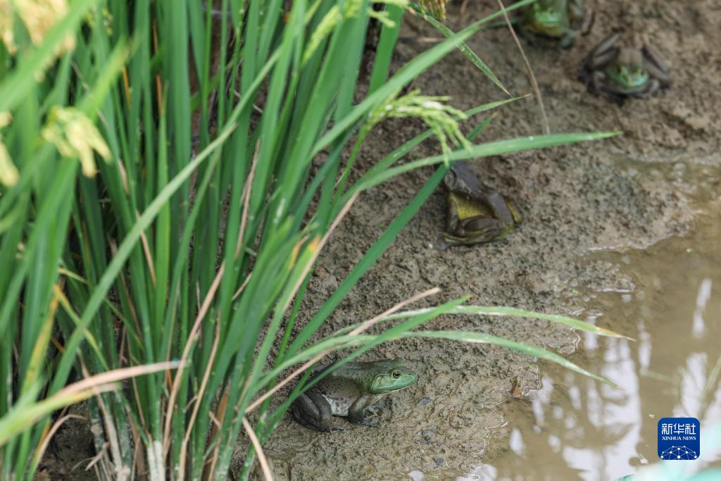 這是10月13日在杭州臨安太陽(yáng)鎮的杭州佳稷農業(yè)生態(tài)稻米種植基地拍攝的稻田里套養的牛蛙,套養能讓每畝增收2000至3000元。