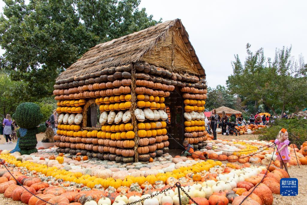 這是10月12日在美國得克薩斯州達拉斯植物園的“南瓜小鎮”里拍攝的一個(gè)南瓜屋。