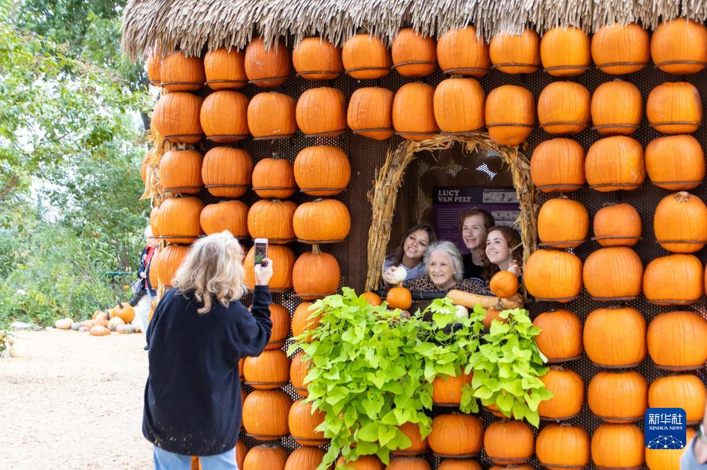 10月12日,在美國得克薩斯州達拉斯植物園的“南瓜小鎮”,游客在一個(gè)南瓜小屋內合影。