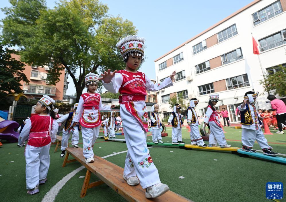 10月13日,天津市和平區第五幼兒園的孩子們參加趣味平衡木比賽。