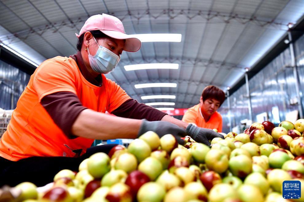 10月13日,在濱州市沾化區下洼鎮,棗農在分揀冬棗。