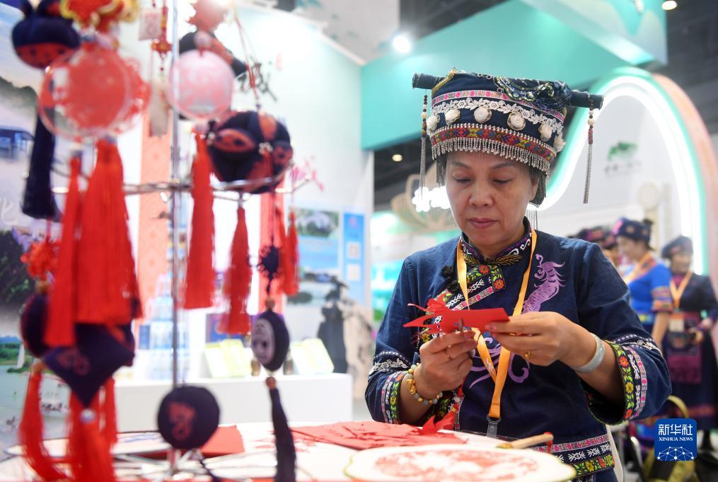 10月13日,在廣西桂林新國際會(huì )展中心,一名非遺傳承人在旅游展上展示剪紙技藝。