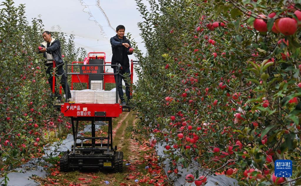 10月13日,白水縣新農田農業(yè)科技有限公司員工在蘋(píng)果種植基地,使用蘋(píng)果采摘作業(yè)平臺收獲蘋(píng)果。