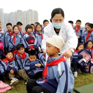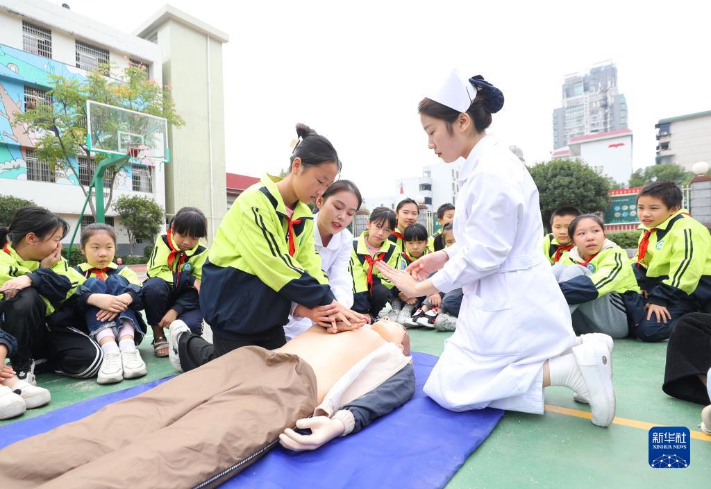 10月13日,在湖南省衡陽(yáng)市蒸湘區實(shí)驗小學(xué),南華大學(xué)護理學(xué)院的志愿者指導小學(xué)生進(jìn)行心肺復蘇急救操作。