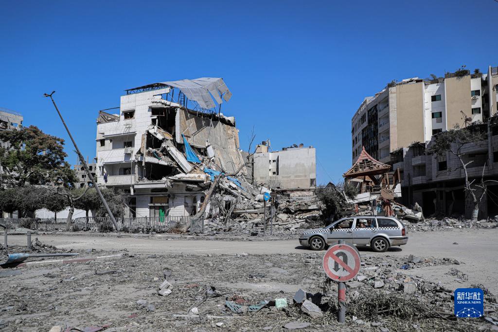 這是10月13日在加沙城拍攝的遭以色列空襲損毀的建筑。