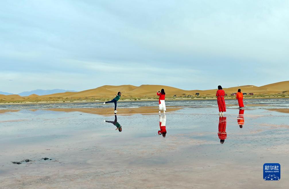 10月13日,游客在內蒙古阿拉善左旗騰格里沙漠中的烏蘭湖拍照。