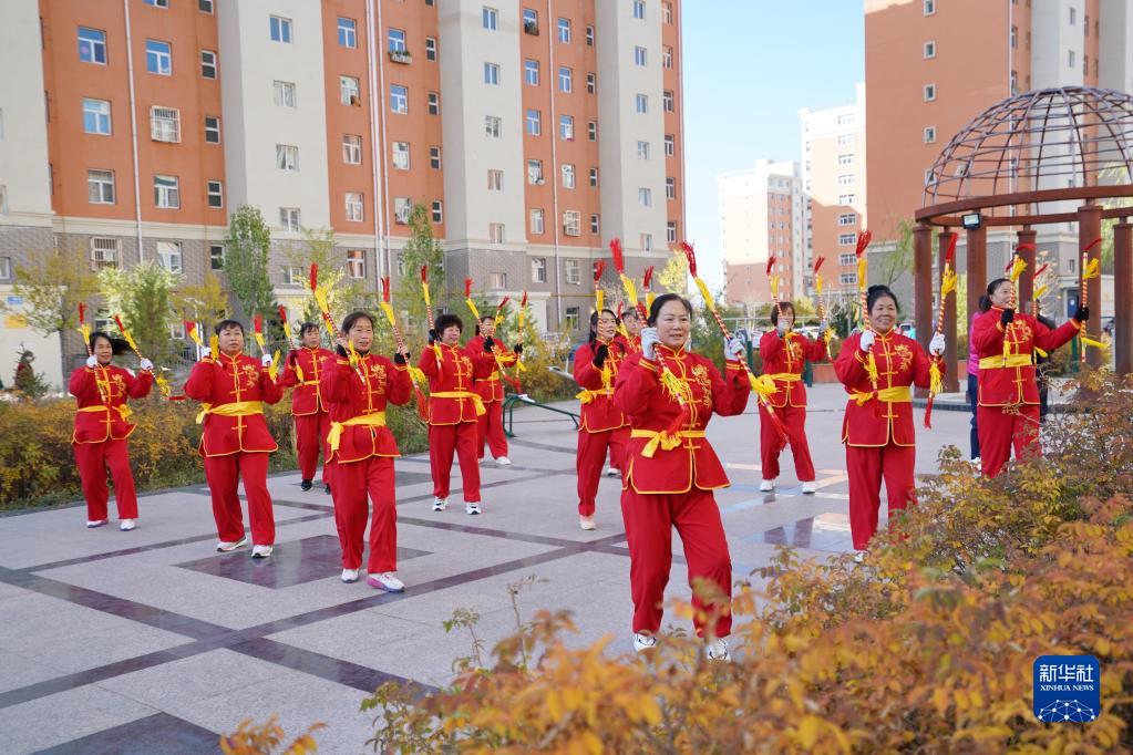 10月13日,河北省康??h怡安康城社區居民在練習康保二人臺霸王鞭。