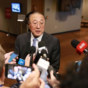 10月13日,在位于紐約的聯(lián)合國總部,中國常駐聯(lián)合國代表張軍(中)在安理會(huì )緊急磋商后回答中外記者提問(wèn)。