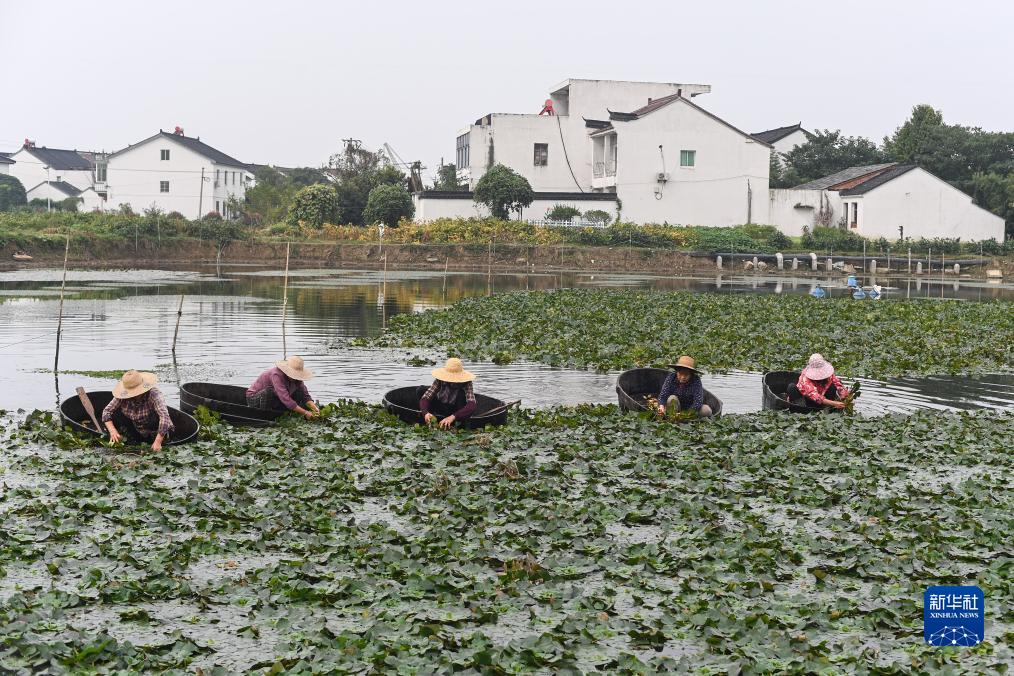 10月14日,在南潯區和孚鎮新荻村菱塘,村民劃著(zhù)菱桶采摘菱角。