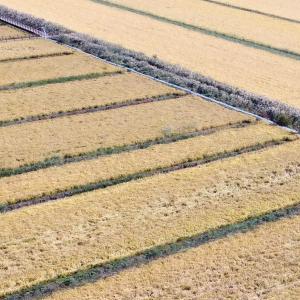 10月14日,收割機在天津市津南區小站鎮會(huì )館村小站稻核心種植區作業(yè)(無(wú)人機照片)。