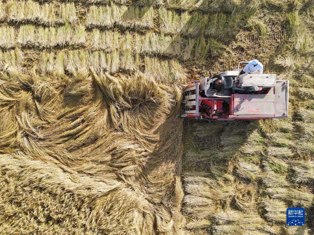 10月13日,新疆阿拉爾市測產(chǎn)田塊,人們操作機械收割水稻(無(wú)人機照片)。