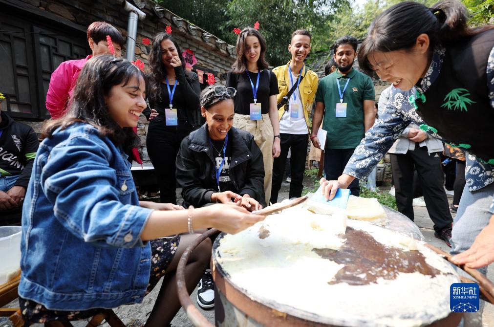 當日,來(lái)自俄羅斯、巴基斯坦、摩洛哥、法國等8個(gè)國家的20多名來(lái)華留學(xué)生走進(jìn)山東省臨沂市沂南縣竹泉村,體驗活字印刷、草編技藝、烙煎餅、做香囊等傳統手工和非遺項目,零距離感受中國鄉村文化魅力。